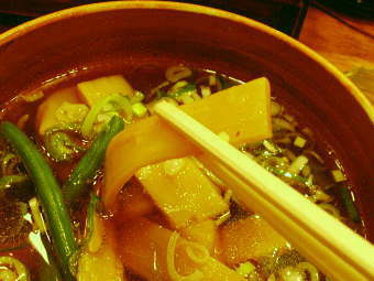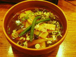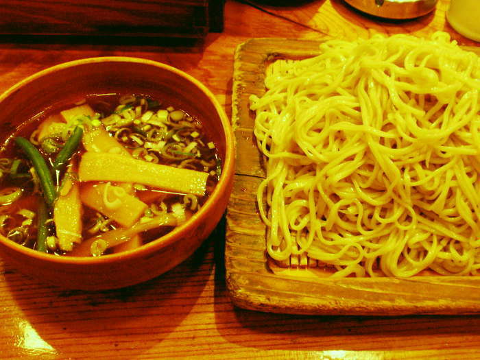 そんな世間のトレンドとは無関係なのが、新宿西口の「新高揚」。ヨドバシカメラ本店の脇にある老舗中の老舗です。透明感のあるトリガラ醤油のつけダレに、小麦粉の風味が香ばしい平打ち麺。具にはメンマ/刻み焼豚/インゲンが使われています。これだけシンプルなスタイルながら、どの流派(?)にも属さない非凡なつけ麺です。
