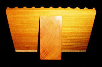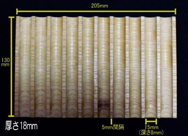 | ▲東急ハンズで加工。木のブロックに15mm径の穴を10本開けて、上から真っ二つに切断すると「半円形の溝」に。ただしこの加工をしてくれるホームセンターは稀で、東急ハンズでも新宿店でNG、横浜店ならOK。同じハンズでも対応が違う。 |