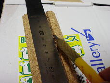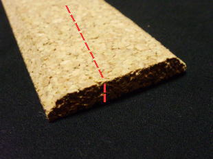 ▲鉄道模型用の道床コルクで厚さは7mm。横浜・馬車道の篠原模型店でゲットした。断面が「斜めカット」なのでデザインがグレイツ。205×28mmにカットして使用した。 |