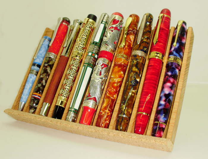 万年筆などを格好よくディスプレーするのに、喫煙具のパイプ用スタンドを使う方も多い。これなら7本用までが売っているし、デザインも格調高い。ただしパイプ用の設計なので、横幅がデカくて邪魔。7本用で30cmもある。その点、今回の自作スタンドは10本用で横幅20.5cm。仮に30cm幅なら、15本用が作れる計算になる。パイプスタンドの2倍以上もコンパクトなのだ(エヘン) |