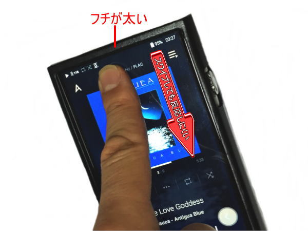 | ▲ケースのフチが太いため、スワイプの反応が悪く、アンプのON/OFF操作にイライラ。 |